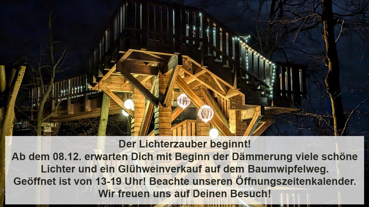 Aufgrund der nassen und teils rutschigen Witterungsverhältnisse bleibt der Baumwipfelweg am kommenden Wochenende geschlossen. Die Saison 2023 ist somit beendet und wir freuen uns Dich im nächsten Jahr wieder bei uns begrüßen zu dürfen.